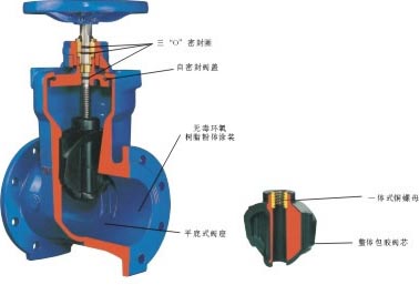 結(jié)構(gòu)特點(diǎn) 1.整體閥蓋暗桿設(shè)計(jì),結(jié)構(gòu)緊湊;閥桿螺母與閘板兩體結(jié)構(gòu),無(wú)卡阻現(xiàn)象發(fā)生;直通道,無(wú)泄留凹腔;閥桿密封采用“O”形密封圈。 2.有優(yōu)秀的防腐性能,殼體內(nèi),外表面噴涂環(huán)氧樹(shù)脂,需要時(shí)內(nèi)表面襯搪瓷;連接螺栓采用內(nèi)六角螺栓,頂部膠封。 3.可靠的衛(wèi)生性環(huán)氧樹(shù)脂符合衛(wèi)生標(biāo)準(zhǔn)GB/T17219-1998,閘板整體包覆符合衛(wèi)生檢驗(yàn)的橡膠;閥桿、閥桿螺母等零件采用不受水腐蝕的不銹鋼或青銅等到材料。 適用飲用水、給排水、污水處理、天然氣與煤氣、工業(yè)以及食品等行業(yè)。